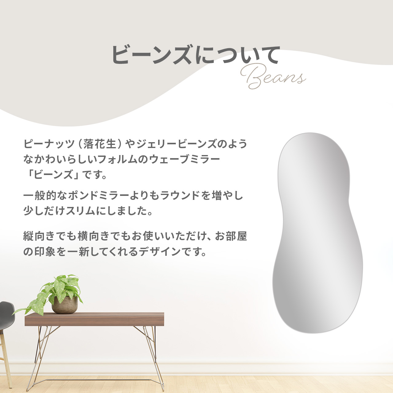 ピーナッツ(落花生)やジェリービーンズのような かわいらしいフォルムのウェーブミラー「ビーンズ」です。