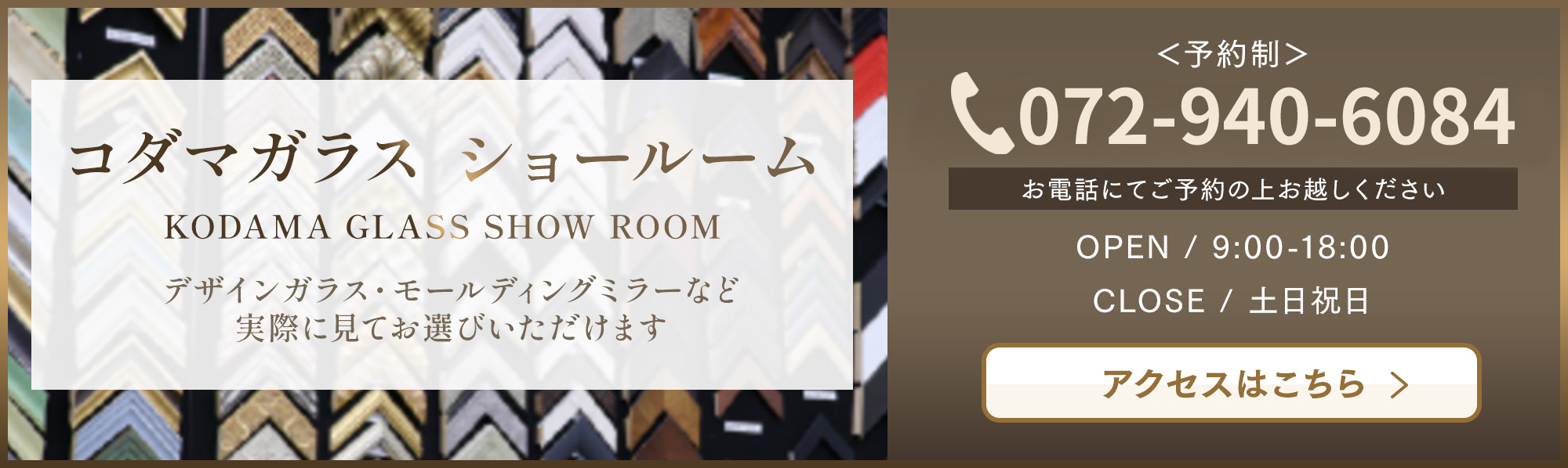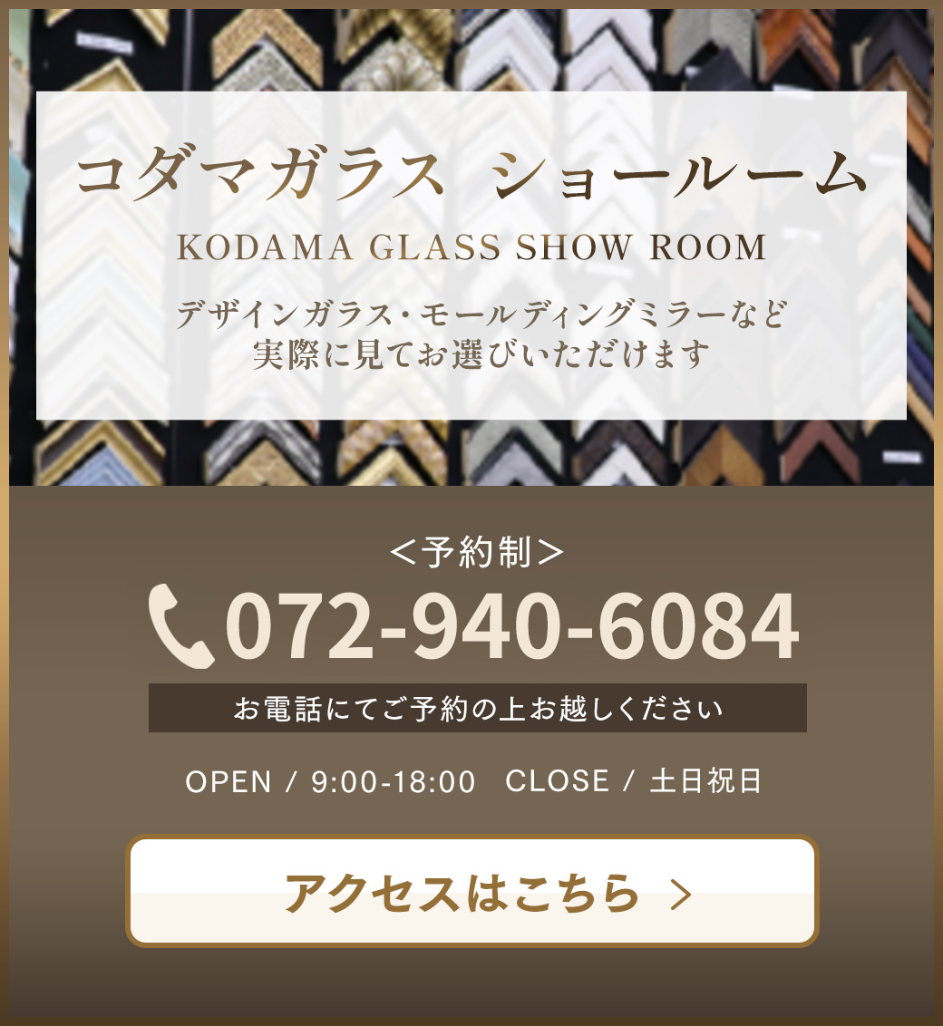 クリアミラー・高透過ミラーをはじめ、額面装飾として色付きミラー(グレー/ブロンズ)もお選びいただけるのは、コダマガラスが多種多様なミラーを扱っているからこそ。その他、べべリング加工により高級感を出すことも可能です。