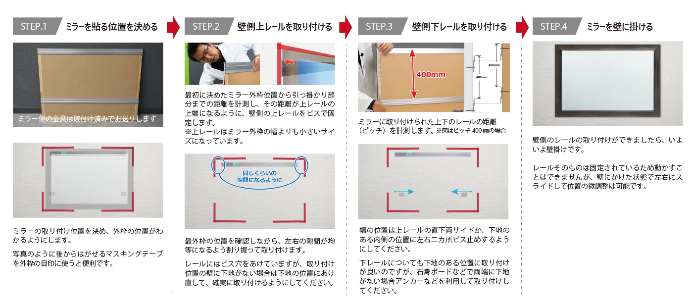 ミラーの裏面にレールを取り付けた状態でお届けいたします。