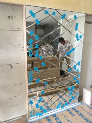 基本的にはミラーマットと変成シリコンで壁面に接着しますが、ミラーマットは貼らずに(捨て貼り)、 変成シリコンのみで位置を微調整しながら 施工すると綺麗に納まります。(変成シリコンが固まるまでの間、1~2日間は落下しないように下部に支えが必要です)