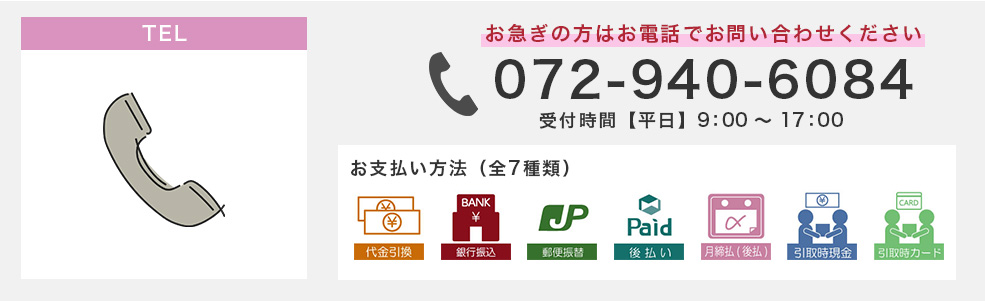 キャンセル・変更の場合は必ずお電話ください TEL:072-940-6084 |